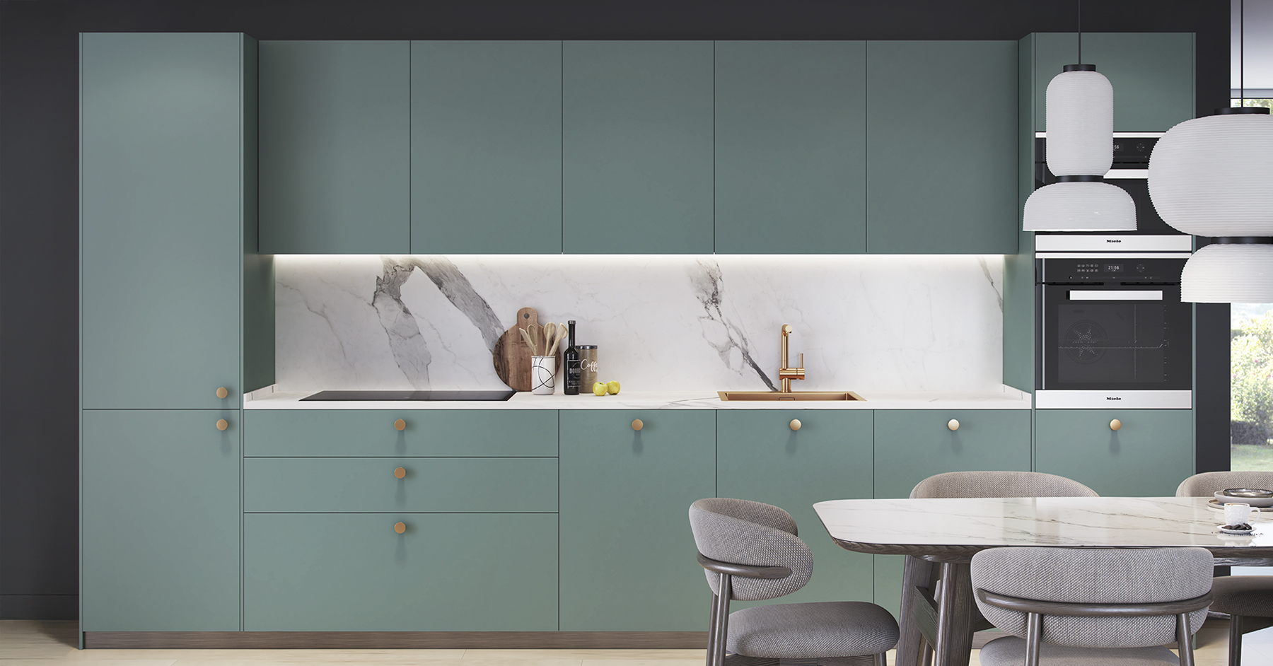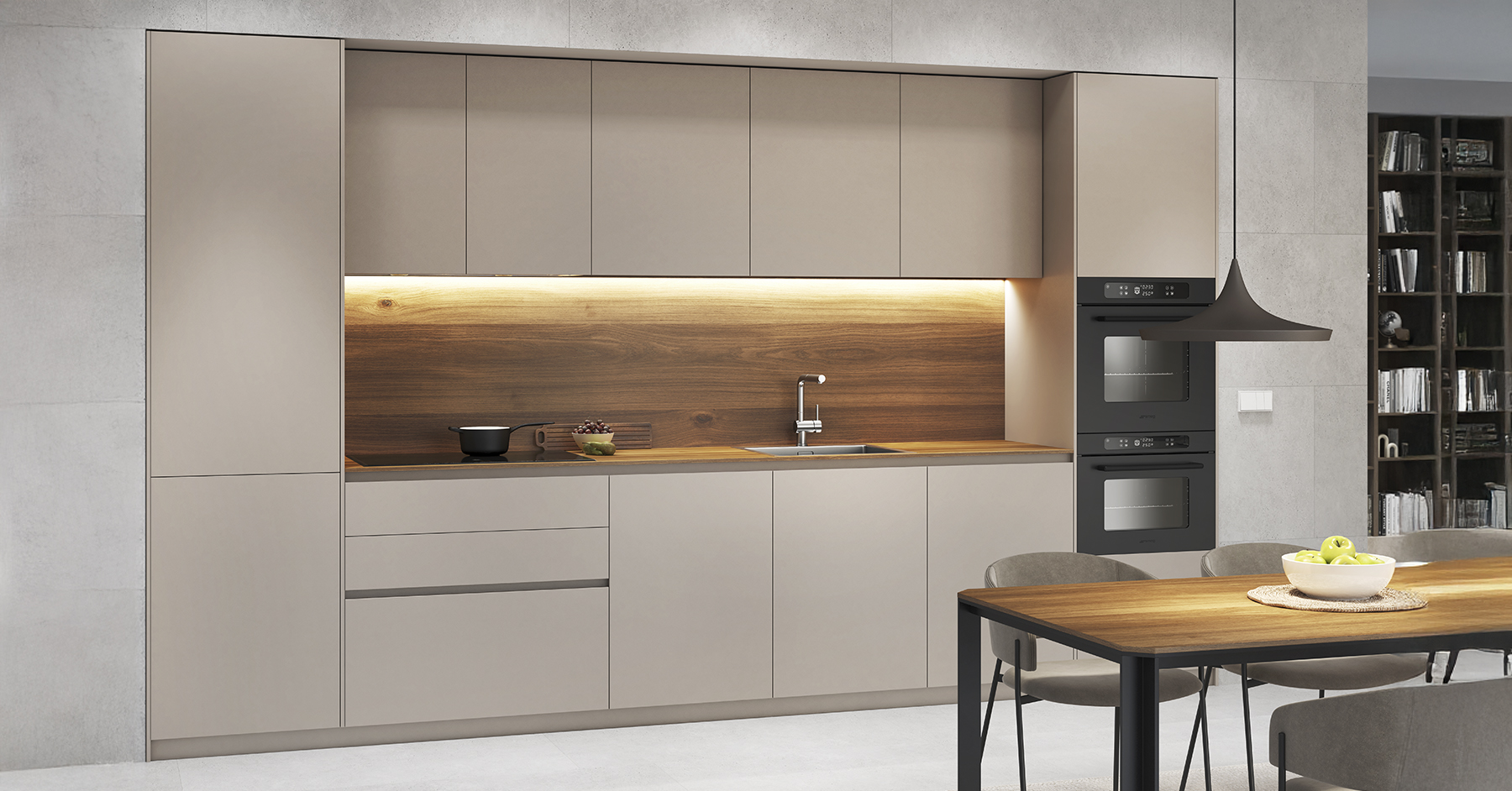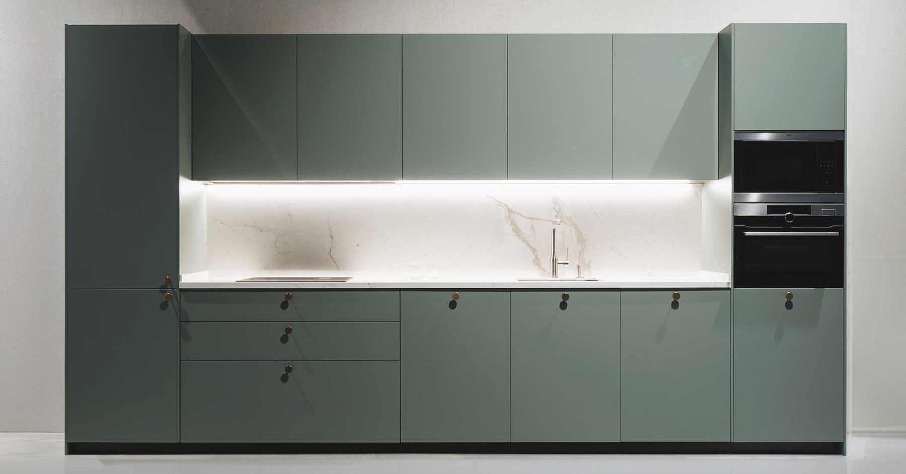 Combina muebles hönnun de un solo frente con gola curva y descubre múltiples distribuciones y colores. Sistema de apertura integrado en el armazón del mueble con forma de L o C. Canto recto en puertas y frentes de cajón.